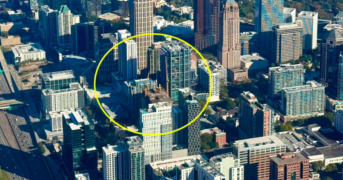 The Rockefeller project's height today in relation to the SkyHouse Midtown apartments (immediately north) and Google's headquarters building. Urbanize Atlanta