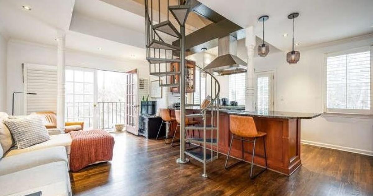 Connecting the levels is what the Atlanta Fine Homes Sotheby’s listing describes as the home’s pièce de résistance—a metal spiral stair that leads up to a versatile if small loft space, a bedroom, and a full bath with rainfall shower (and one of several skylights).
