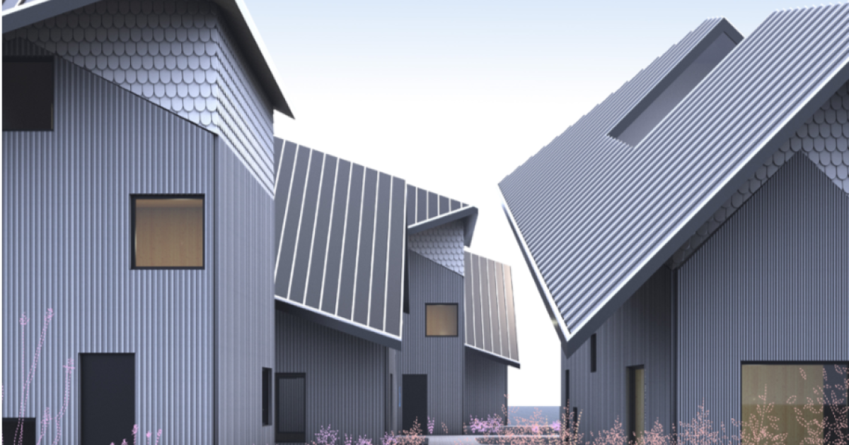 Example of unique geometry and cladding, sloped roofs, and top-floor social spaces at X Houses. Courtesy of MALL