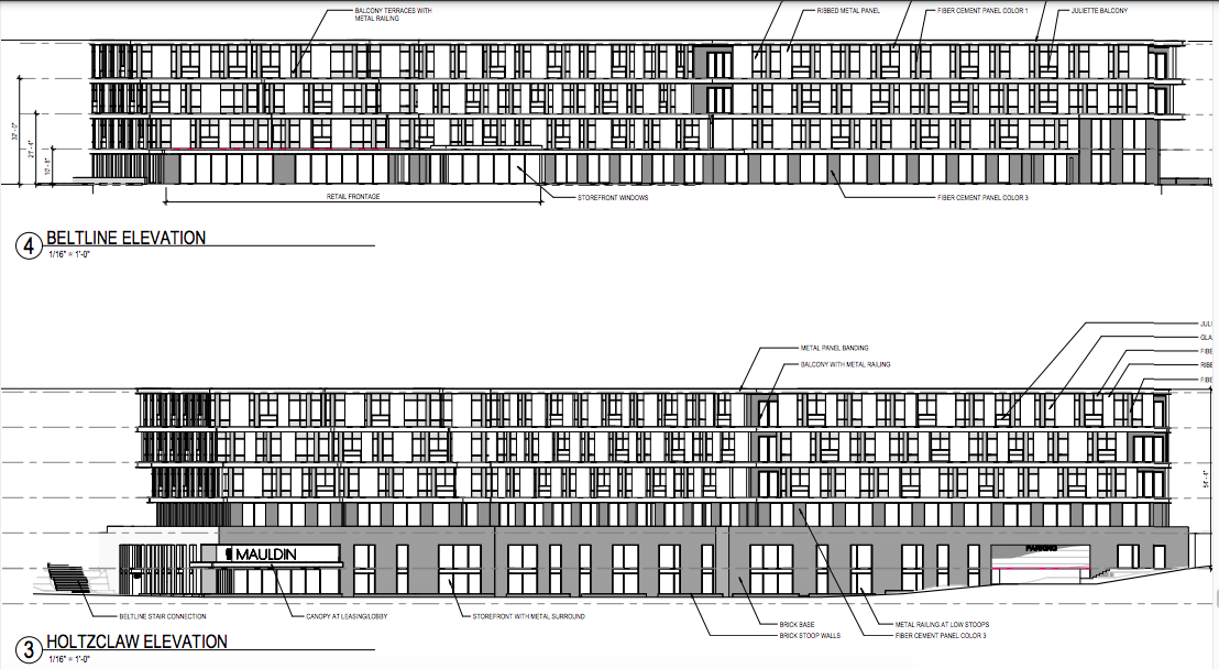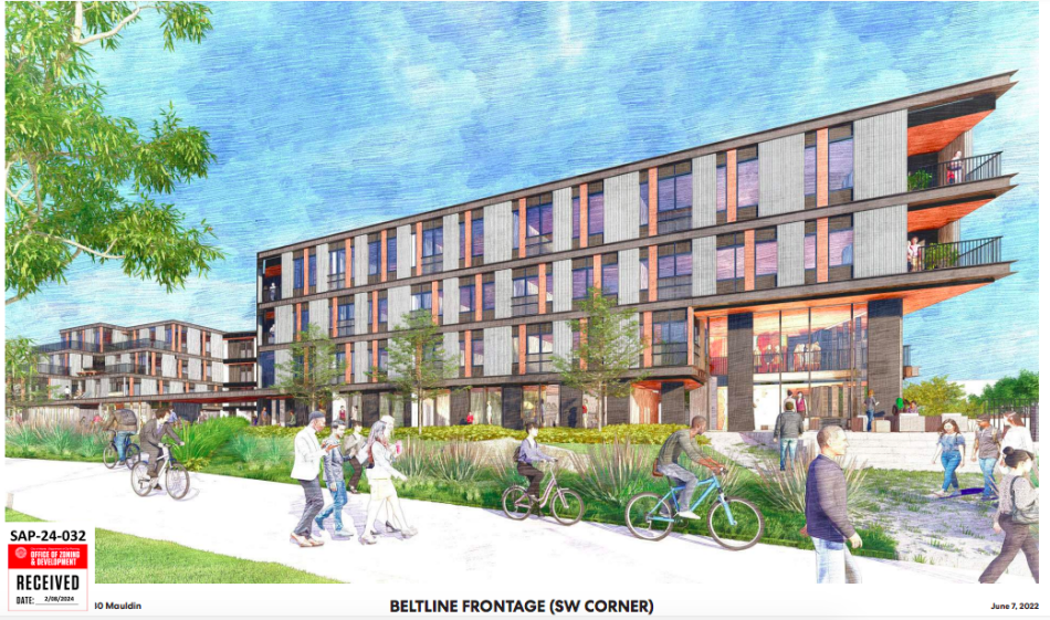 According to previous renderings, how the completed 930 Mauldin St. project would look to Beltline patrons, with retail spaces depicted at left. Perkins & Will; via City of Atlanta Office of Zoning and Development