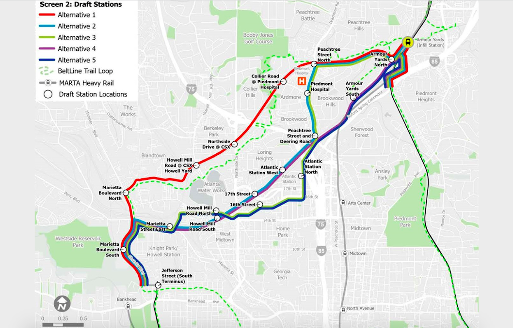 “Each alignment,” Beltline planners note, “has the potential to connect to the proposed MARTA infill station at Armour Yards or, if necessary, reach the Lindbergh Center MARTA station.”