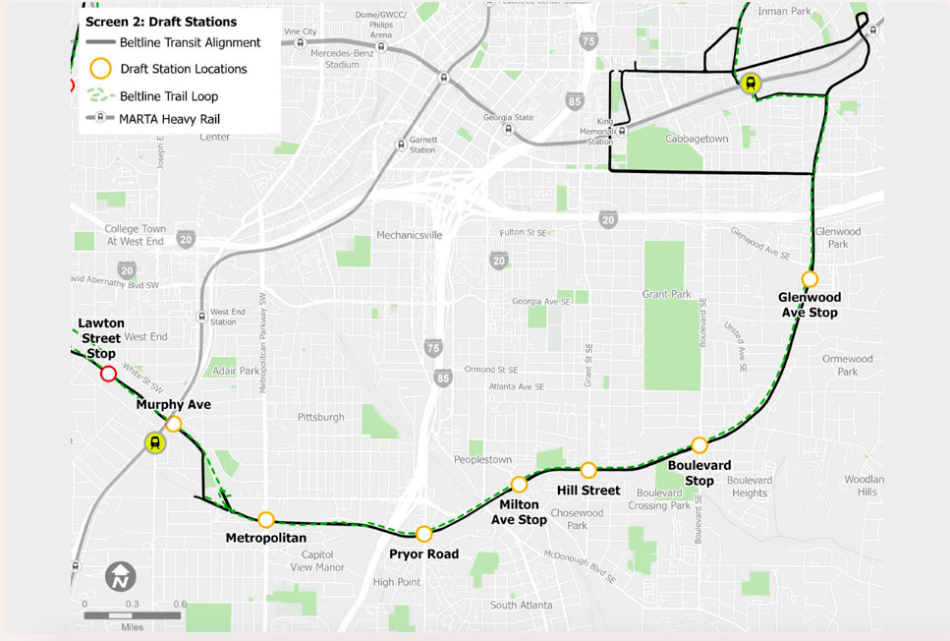 Alongside a consultant team lead by Kimley-Horn, the Beltline has wrapped the study’s first phase. It pinpoints where transit routes could go—and where up to 21 stops could be located—but it doesn’t specify which mode of transportation would be used.