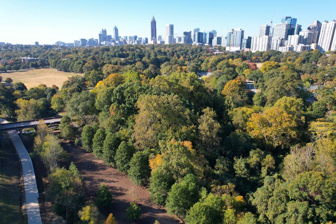 The latest Beltline Northeast Trail section to open, in relation to Piedmont Park's dog park. Photo by LoKnows Drones; courtesy of Atlanta Beltline Inc.