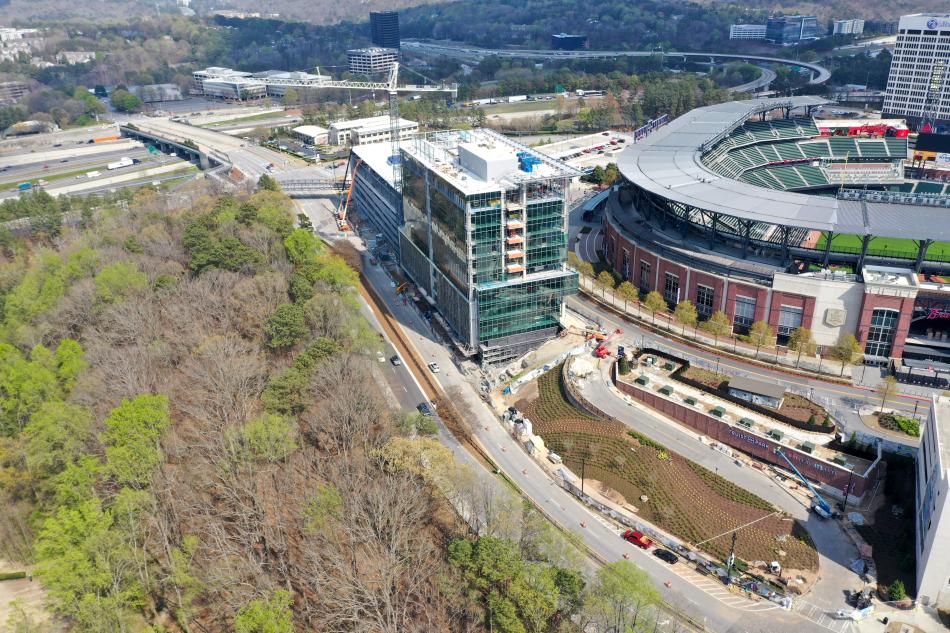 The Truist Securities office project, in relation to the MLB ballpark, as shown after it had topped out last spring. Courtesy of Atlanta Braves/Braves Development Company