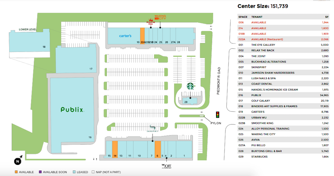 Existing retailers that have remained include Piu Bello, Urban Wu, Eye Gallery, Relax the Back, The Joint, Buckhead Alterations, Jamison Shaw, Lush Nails & Spa, Coast Dental, and a standalone Starbucks near the main entrance.