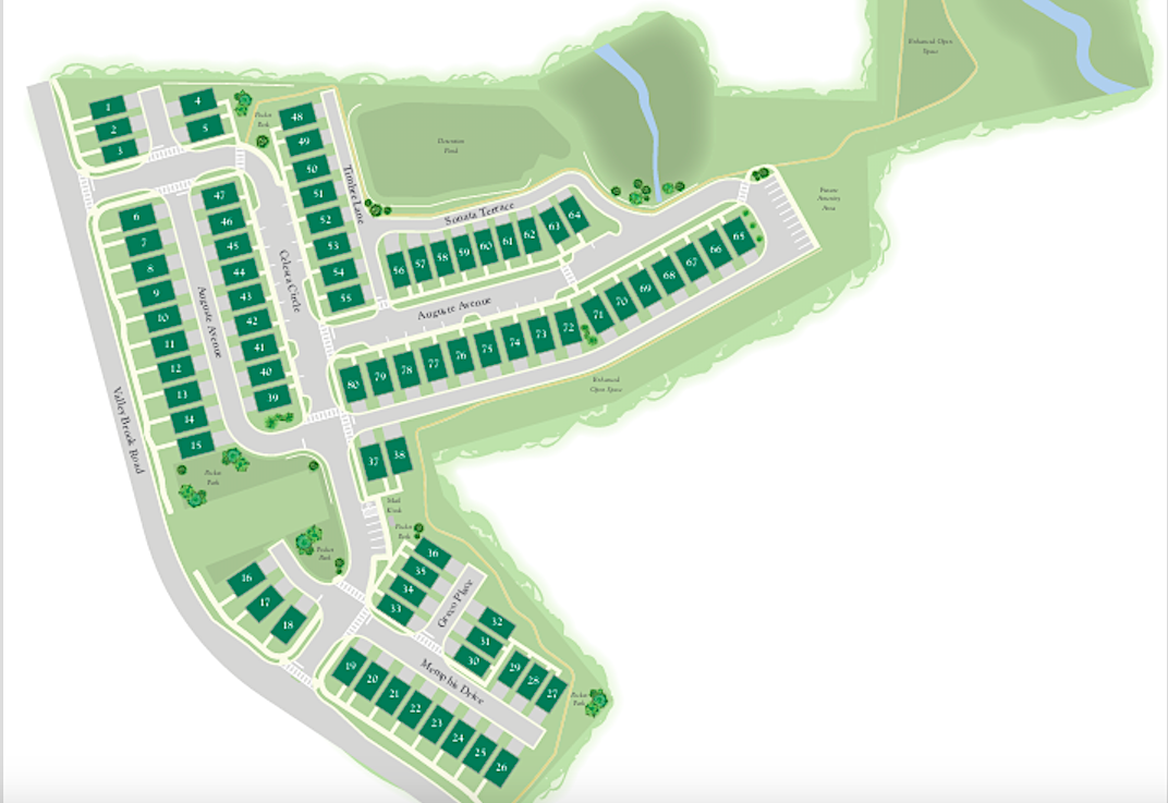 Plans for the 731 Valley Brook Road site also call for extensive greenspace, walking trails, and a dog park tucked around the community. Several modest single-family homes were cleared from the acreage as infrastructure including streets was put in several years ago.