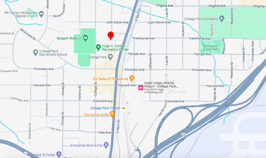 The Promise Career Institute's Main Street location, in relation to College Park's MARTA station, downtown, and Interstate 85. Google Maps