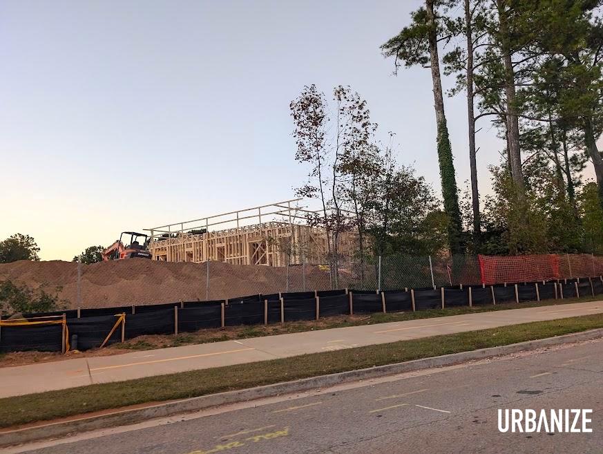 The first Village at Legacy buildings under vertical construction this week along Katie Kerr Drive. Josh Green/Urbanize Atlanta