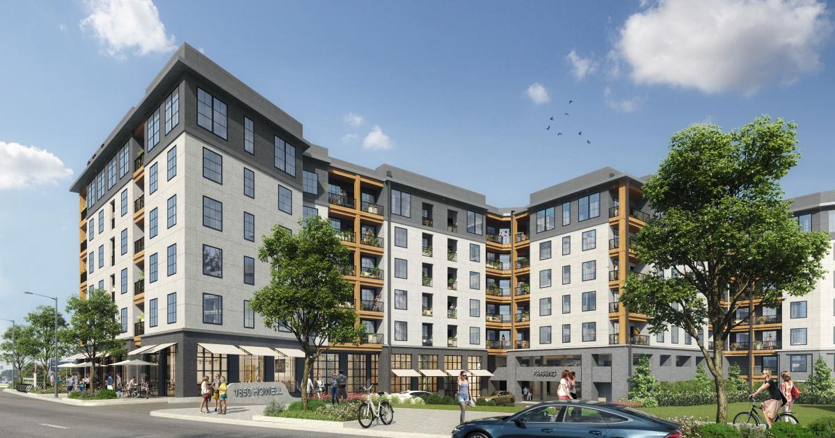 The Howell will include a mix of one, two, and three-bedroom apartments and an unspecified amount of commercial space. According to new renderings, an amenities area atop an exposed parking deck will face the interstate.