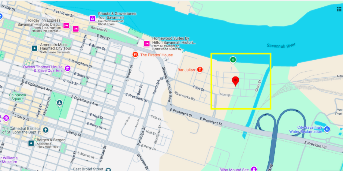 Upper East River's riverfront site, just east of downtown Savannah's historic squares and famously walkable blocks. Google Maps