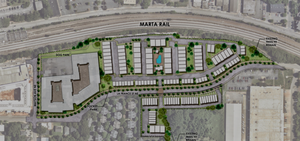 In Edgewood, Toll Brothers officials have told Urbanize Atlanta plans call for 240 condos and townhomes on both sides of La France Street, immediately east of the standing apartments.