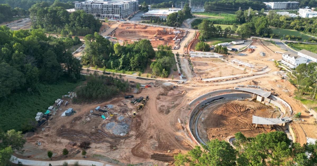 Construction progress at the Englewood greenspace project shown in recent weeks south of downtown, with the new Upton apartments in the middle distance. Courtesy of Phil Veasley