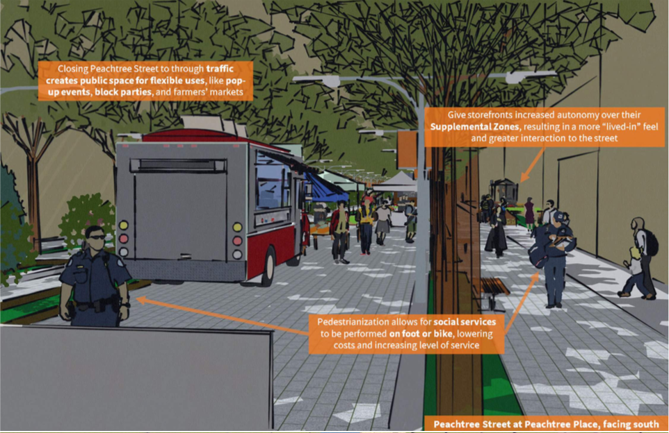 Under the “Peachtree Pedestrian Promenade” section, the study proposes extensive changes that would pedestrianize a section of Atlanta’s signature street in hopes of activating vacant retail and capitalizing on high-density residential additions to the neighborhood.