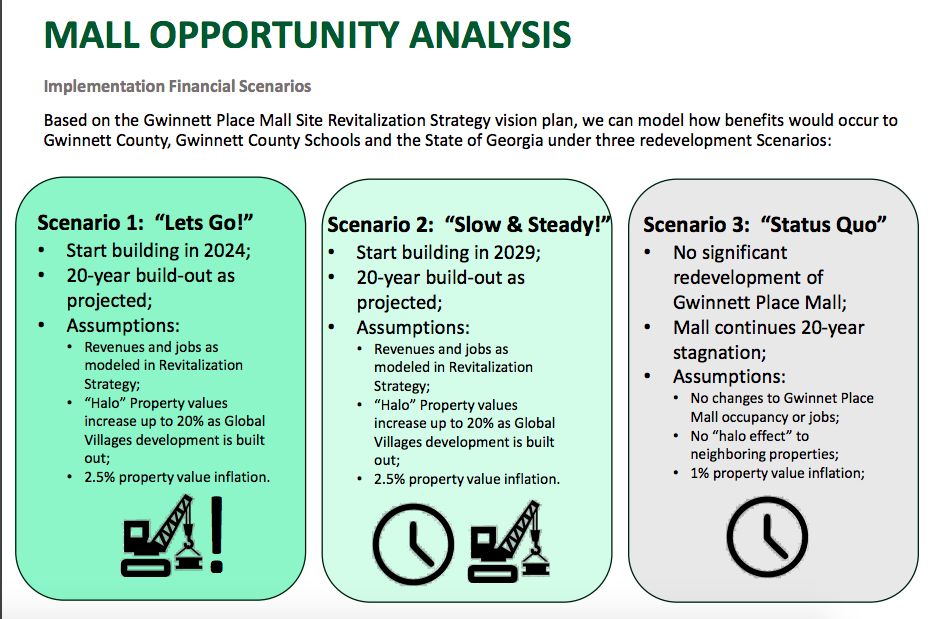 The recent analysis compiled three models showing how the sooner Gwinnett Place Mall's projected two-decade redevelopment process begins, the more beneficial it could be for the county.