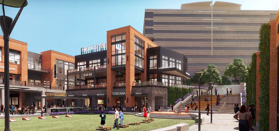 High Street's initial phase is being built around a core of greenspaces, with retail and residential uses lining the public realm. GID Development Group/High Street; designs, Dwell Design Studio