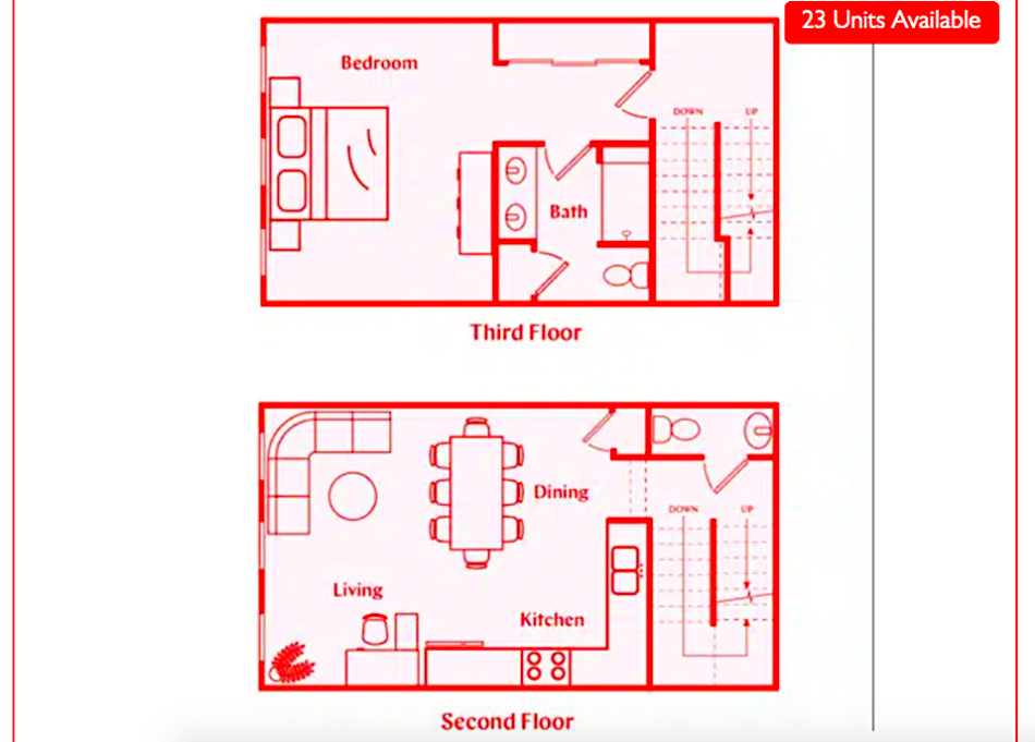 Bottom levels of the largest floorplan currently available at LaFrance Square, the three-bedroom Whitefoord option. LaFrance Square