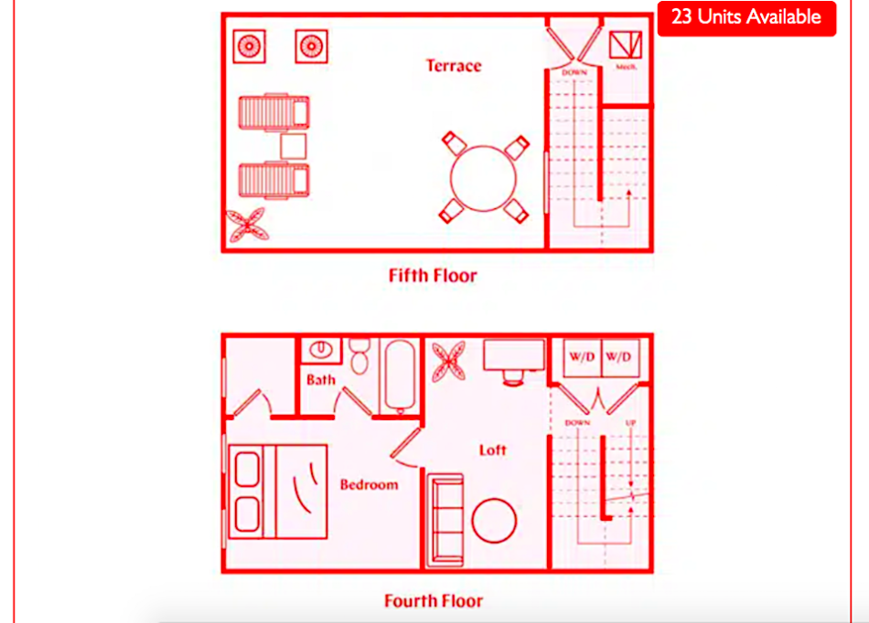 That rents a two-bedroom, two and ½-bathroom floorplan called the Oakford with 1,661 square feet—spread across a whopping five stories, including the rooftop terrace. (Note: Only one unit is offered at that price now; 22 others with the same floorplan cost $3,450 monthly. Two months of free rent is being dangled as an incentive for some units.)