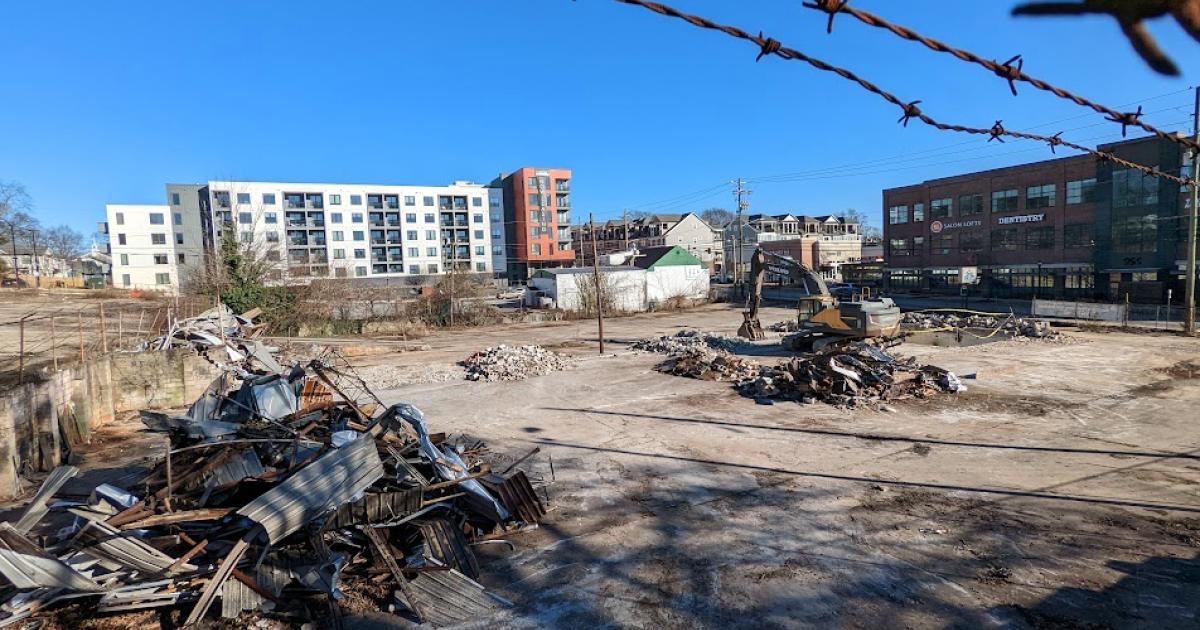 The corner building housing popular diner Home Grown, shown at right, wasn't impacted by demolition. Josh Green/Urbanize Atlanta