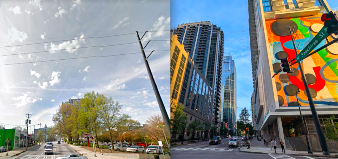 Looking south from Midtown's 14th and West Peachtree streets intersection in 2014, left, and nine years later. Google Maps/Urbanize Atlanta