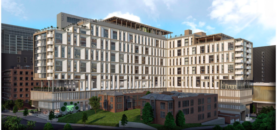 Other components—149 flexible-stay hotel rooms and 6,600 square feet of coworking space—have gotten slightly larger. A small café and public fitness center spanning 5,000 square feet would also be included, according to the DRC agenda.