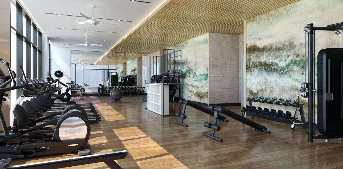 A fitness studio on the roof, described as "club-quality," will include Peloton bikes, a TRX system, and 270-degree skyline views, per developers. Mill Creek Residential/Modera Parkside