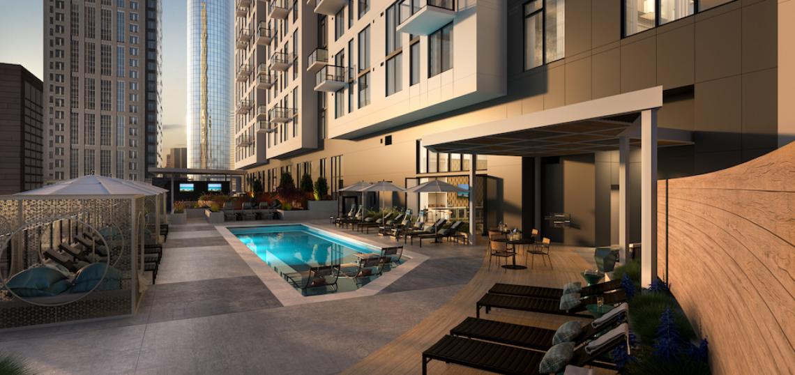 The building's Spectator terrace has a swimming pool and sundeck, hammock cabanas and daybeds, multiple fireside lounges, and grilling stations.Courtesy of Greystar