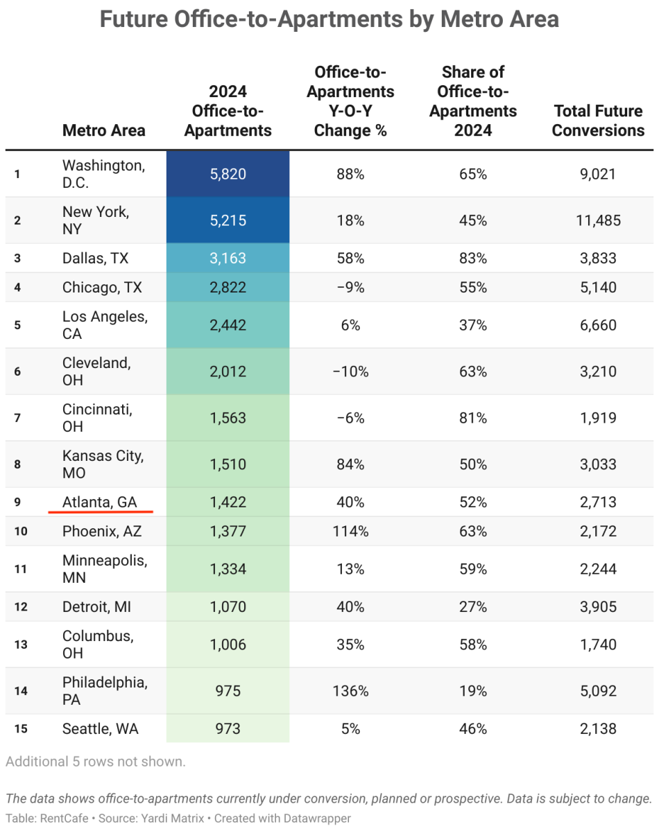 The top metro for office conversions is Washington D.C., where 5,820 units in the pipeline are more than quadruple Atlanta’s count, per RentCafe's numbers.