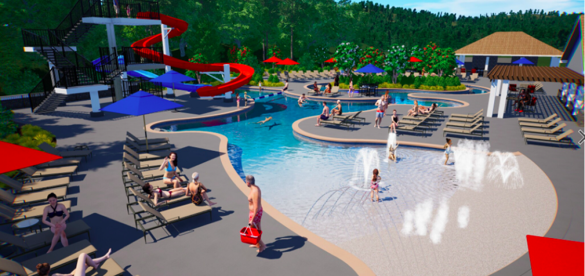 Those luxury features are set to include a beach-entry swimming pool with a waterslide and lazy river, a clubhouse, cabanas, bocce and pickleball courts, a playground and dog park, and fire pit areas—in addition to activities on the actual river such as paddle-boarding, kayaking, and fishing.