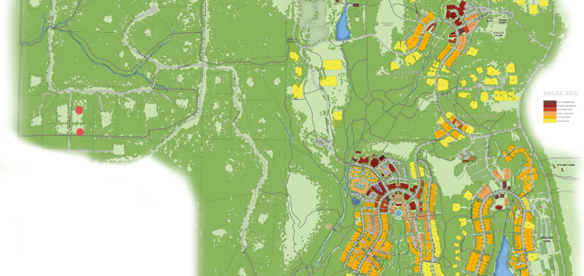 The latest two farmette sites released by Serenbe (at far left), located just west of the main community and linked together by pathways. Serenbe