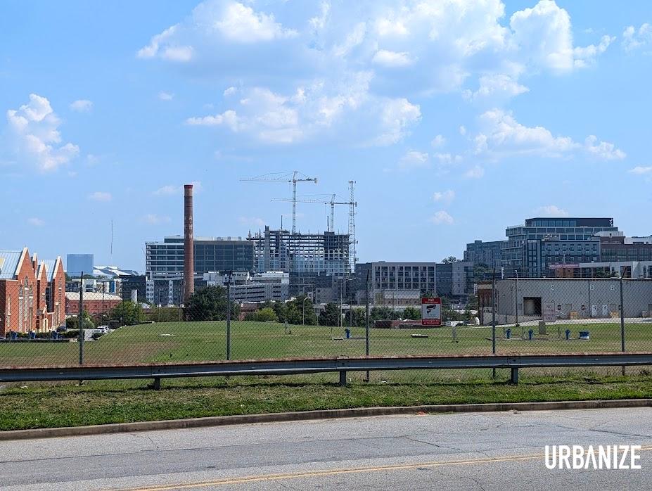 As seen in July, looking south from 17th Street, how the Stella project was beginning to stand out among other buildings in the district, including some at higher elevations. Josh Green/Urbanize Atlanta